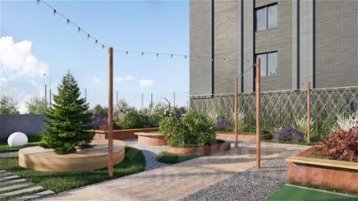Для всех возрастов: пешеходные дорожки, газоны, клумбы, ель в центре двора.