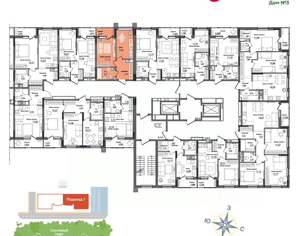 На этаже располагается 7 квартир с успешно зарекомендовавшими себя планировками "Умные метры": от 1-комнатных квартир площадью 36 м до 3-комнатных квартир на 75 м. Уже традиционно на выбор доступны варианты с классическими кухнями или кухнями-гостиными.