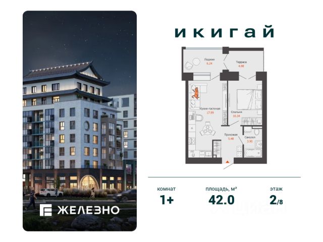 В новом жилом комплексе комфорт-класса "Знак" продается 1-комнатная квартира площадью 42.00 кв. м с отделкой white box. Квартира находится на 2 этаже 8-этажного корпуса 1. Девелопер проекта - федеральный застройщик "Железно". "Знак" - начало добрых перемен. Это жилой комплекс, где всё складывается правильно. Перемены появляются там, где для них создана среда. Когда парк под окнами, а не на другом конце города. Когда коворкинг рядом, и можно сосредоточиться, не уезжая в центр. Когда во дворе - площадки для тренировок, йоги, движения. "Знак" - как символ решений, которые привели к лучшему. Знаковое место Здесь вас ждут оживлённые площади, наполненные событиями и городским ритмом, и уютные бульвары для неспешных прогулок. Для ценителей тишины и созерцания найдутся уединённые уголки, а поклонников активного образа жизни ждут современные и технологичные спортивные площадки. Архитектура как знак качества Жилой комплекс "Знак" состоит из 6 секций высотой 7-8 этажей, лаконичный ансамбль которых окружает внутренний зеленый двор с местами для отдыха жителей. Природные материалы - древесина, камень, - натуральные оттенки земли и травы усиливают гармонию с природой. Комбинированный вентилируемый фасад, прочный кирпичный фундамент, большие окна с 2-камерными стеклопакетами и 5-камерным ПВХ-профилем гарантируют долгий срок эксплуатации, тишину и благоприятный микроклимат в каждой квартире. Лобби: искусство, в котором живут Продуманное пространство с мягкими креслами и камерными зонами отдыха создаёт атмосферу уюта, где искусство становится частью повседневности. Это вдохновляющая среда, которая пробуждает чувства и воображение с первого взгляда. Дизайн лобби воплощает концепцию эмоций в искусстве через пластику и форму. Доминантой становятся выразительные гипсовые барельефы в виде масок, объемность которых подчеркивает многоуровневое освещение. В отделке гармонично сочетаются натуральные материалы: металл контрастирует с тёплым гипсом, а керамогранит - с текстильными панно в зонах отдыха. О застройщике "Железно" - федеральный девелопер со смыслом, создающий умные мини-города с развитой инфраструктурой и высоким уровнем сервиса. За 14 лет беспрерывного развития и стремительного роста компания точно определила своё предназначение: мы с любовью и уважением к человеку создаём города будущего, меняя мир и жизнь людей к лучшему. • 6 городов России: Киров, Ижевск, Ульяновск, Екатеринбург, Пермь, Волгоград. • Строим парки, школы и детские сады. • Земельный банк более 2 000 000 м2. • ТОП-4 застройщиков России по качеству жилья (ЕРЗ.рф от июня 2025). • 28 проектов. • 6-кратные победители и 25-кратные финалисты премии Urban Awards.