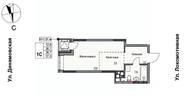 Потолок 2,7 м.