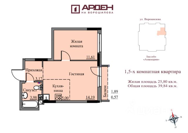 Продаётся 1-комнатная квартира в строящемся доме (Дом 1), срок сдачи: IV-кв. 2027, общей площадью 39.84 кв.м., на 6 этаже. Новый жилой комплекс "Арден на Ворошилова" от застройщика "ГК Арден" расположен по адресу: Удмуртская Республика, г. Ижевск, ул. Ворошилова