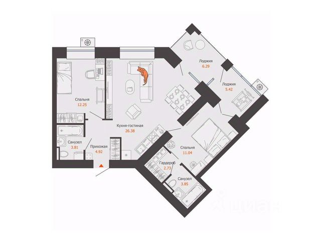 В новом жилом комплексе комфорт-класса "Знак" продается 2-комнатная квартира площадью 68.00 кв. м с отделкой white box. Квартира находится на 5 этаже 7-этажного корпуса 1. Девелопер проекта - федеральный застройщик "Железно". "Знак" - начало добрых перемен. Это жилой комплекс, где всё складывается правильно. Перемены появляются там, где для них создана среда. Когда парк под окнами, а не на другом конце города. Когда коворкинг рядом, и можно сосредоточиться, не уезжая в центр. Когда во дворе - площадки для тренировок, йоги, движения. "Знак" - как символ решений, которые привели к лучшему. Знаковое место Здесь вас ждут оживлённые площади, наполненные событиями и городским ритмом, и уютные бульвары для неспешных прогулок. Для ценителей тишины и созерцания найдутся уединённые уголки, а поклонников активного образа жизни ждут современные и технологичные спортивные площадки. Архитектура как знак качества Жилой комплекс "Знак" состоит из 6 секций высотой 7-8 этажей, лаконичный ансамбль которых окружает внутренний зеленый двор с местами для отдыха жителей. Природные материалы - древесина, камень, - натуральные оттенки земли и травы усиливают гармонию с природой. Комбинированный вентилируемый фасад, прочный кирпичный фундамент, большие окна с 2-камерными стеклопакетами и 5-камерным ПВХ-профилем гарантируют долгий срок эксплуатации, тишину и благоприятный микроклимат в каждой квартире. Лобби: искусство, в котором живут Продуманное пространство с мягкими креслами и камерными зонами отдыха создаёт атмосферу уюта, где искусство становится частью повседневности. Это вдохновляющая среда, которая пробуждает чувства и воображение с первого взгляда. Дизайн лобби воплощает концепцию эмоций в искусстве через пластику и форму. Доминантой становятся выразительные гипсовые барельефы в виде масок, объемность которых подчеркивает многоуровневое освещение. В отделке гармонично сочетаются натуральные материалы: металл контрастирует с тёплым гипсом, а керамогранит - с текстильными панно в зонах отдыха. О застройщике "Железно" - федеральный девелопер со смыслом, создающий умные мини-города с развитой инфраструктурой и высоким уровнем сервиса. За 14 лет беспрерывного развития и стремительного роста компания точно определила своё предназначение: мы с любовью и уважением к человеку создаём города будущего, меняя мир и жизнь людей к лучшему. • 6 городов России: Киров, Ижевск, Ульяновск, Екатеринбург, Пермь, Волгоград. • Строим парки, школы и детские сады. • Земельный банк более 2 000 000 м2. • ТОП-4 застройщиков России по качеству жилья (ЕРЗ.рф от июня 2025). • 28 проектов. • 6-кратные победители и 25-кратные финалисты премии Urban Awards. 2-комнатная квартира, примерная площадь 70 м2 в республике Удмуртская.