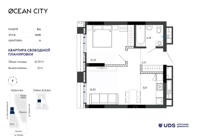 Продаётся 2-комнатная квартира квартира в 10 минутах от центра Ижевска, ул Холмогорова, площадью 58.00 кв. м. Квартира находится в жилом комплексе бизнес-класса "МИРЫ" от федерального застройщика "Железно". Флагманский проект "МИРЫ" - место, где абсолютная безопасность, гармония тишины и привилегия жизни в шаге от делового центра объединяются в единый ансамбль. Здесь соединяются эстетика природы и энергия городской жизни - вы сами выбираете свой ритм каждый день. Каждая из трех башен обладает собственным характером, выраженным через благородную палитру металлов - золото, серебро, бронзу. Динамичный переменный силуэт - от 13 до 16 этажей - особенно красиво выделяется с наступлением темноты: архитектурная подсветка превращает дома в настоящие арт-объекты. На территории жилого комплекса будет 3 двора, каждый из которых воплощает уникальную природную стихию. Элементы из бронзы символизируют устойчивость Земли, серебряные детали - легкость Воды, а яркое золото - энергичный Огонь. Каждое из этих уникальных пространств станет приватным уголком для активного и тихого отдыха резидентов, семейных прогулок и игр детей. Преимущества: - Закрытая территория - Умный дом - Wi-Fi на всей территории, Face ID, умные лифты - Повышенная шумоизоляция квартир; - Индивидуальные гаражные боксы; - Собственные котельные - гарантия комфортного микроклимата; - Вся необходимая инфраструктура в ближайшей доступности: школы, детские сады, магазины, торговые центры и многое другое. Успейте приобрести квартиру на выгодных условиях! Чтобы узнать подробности, обращайтесь за консультацией по телефону.