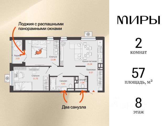 Продаётся 2-комнатная квартира квартира в 10 минутах от центра Ижевска, ул Холмогорова, площадью 59.00 кв. м. Квартира находится в жилом комплексе бизнес-класса "МИРЫ" от федерального застройщика "Железно". Флагманский проект "МИРЫ" - место, где абсолютная безопасность, гармония тишины и привилегия жизни в шаге от делового центра объединяются в единый ансамбль. Здесь соединяются эстетика природы и энергия городской жизни - вы сами выбираете свой ритм каждый день. Каждая из трех башен обладает собственным характером, выраженным через благородную палитру металлов - золото, серебро, бронзу. Динамичный переменный силуэт - от 13 до 16 этажей - особенно красиво выделяется с наступлением темноты: архитектурная подсветка превращает дома в настоящие арт-объекты. На территории жилого комплекса будет 3 двора, каждый из которых воплощает уникальную природную стихию. Элементы из бронзы символизируют устойчивость Земли, серебряные детали - легкость Воды, а яркое золото - энергичный Огонь. Каждое из этих уникальных пространств станет приватным уголком для активного и тихого отдыха резидентов, семейных прогулок и игр детей. Преимущества: - Закрытая территория - Умный дом - Wi-Fi на всей территории, Face ID, умные лифты - Повышенная шумоизоляция квартир; - Индивидуальные гаражные боксы; - Собственные котельные - гарантия комфортного микроклимата; - Вся необходимая инфраструктура в ближайшей доступности: школы, детские сады, магазины, торговые центры и многое другое. Успейте приобрести квартиру на выгодных условиях! Чтобы узнать подробности, обращайтесь за консультацией по телефону.