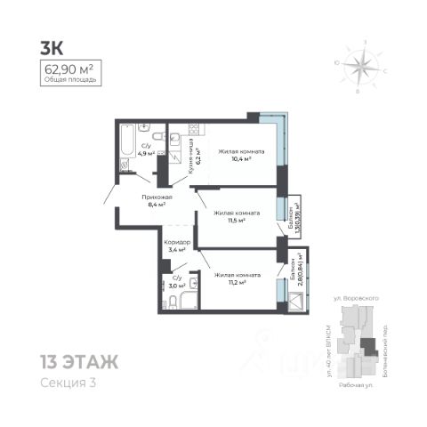 Продаётся 3-комнатная квартира в строящемся доме (Дом 7), срок сдачи: IV-кв. 2028, общей площадью 70.3 кв.м., на 13 этаже. Квартира от застройщика КОМОССТРОЙ. Покупка защищена ФЗ 214 с использованием эскроу счетов.