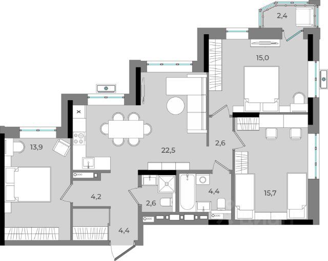 Продаётся 3-комнатная квартира в сданном доме (Шестой дом-квартал), срок сдачи: IV-кв. 2024, общей площадью 89 кв.м., на 5 этаже. Первый квартал — 9-секционный дом с переменной высотностью 6, 9 и 14 этажей с закрытым двором и подземным паркингом