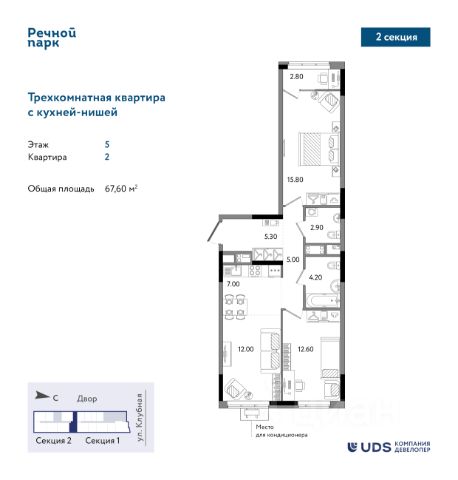 Трехкомнатная квартира евро-планировки в 25-этажной секции ЖК "Речной парк", дом 2. Кухня-гостиная 19 м2 правильной прямоугольной формы с выходом на остекленную теплую лоджию. 2 отдельные спальни, в которых можно разместить всю необходимую мебель и эргономично распланировать пространство. В квартире 2 санузла, в одном из них можно поставить стиральную машину. Грязная зона прихожей отделена от жилой части, для уличной одежды и обуви предусмотрена ниша для шкафа под верхнюю одежду и обувь. Окна выходят на восток, комнаты светлые - уровень подоконника 60 см от пола, высота окна 1,7 м.