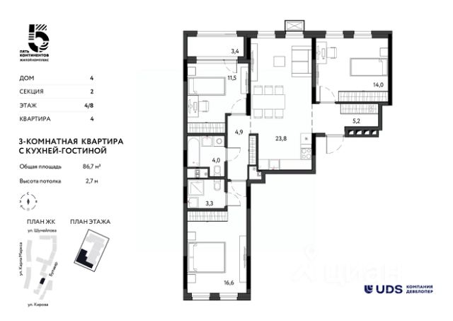 Бизнес-класс на ул. Кирова. Воплощайте мечты о доме в бульварном квартале "Пять континентов". Здесь вы сможете жить в центре Ижевска в эстетичном современном пространстве. Дома комплекса спроектированы по европейским тенденциям международным архитектурным бюро MLA+. Здесь общественные городские и частные зоны разделены не привычными заборами, а гармонично соседствуют друг с другом. Вдоль домов "Пяти континентов" пройдет городской пешеходный бульвар и станет новым маршрутом прогулок и отдыха. Бульвар начнется со сквера на пересечении улиц Кирова и Карла Маркса. И уже сейчас часть сквера построена, приходите и оцените вживую. Если вы хотите жить в невысотном доме в спокойной обстановке, то в "Пяти континентах" вам подойдут уютные дома с эркерами и лоджиями высотой всего 6, 7 и 9 этажей. А если нравятся высотные дома, то в "Пяти континентах" вы увидите и высотные секции внутри квартала высотой 12 и 17 этажей. Ездить на автомобиле ежедневно или добираться пешком жителям "Пяти континентах" удобно одинаково. В комплексе есть подземный паркинг, и, в целом, он выгодно расположен на пересечении улиц Кирова и Карла Маркса, рядом с остановкой "Магазин "Океан". В 15 минутах хотьбы - Центральная площадь и набережная. Здания комплекса примыкают друг другу торцами и создают единую архитектурную форму. Дома по обе стороны бульвара задают направление для прогулок, а волнообразный рисунок брусчатки и плавные изгибы делают бульвар похожим на русло реки. Каждый дом комплекса отличается от другого этажностью, формой, цветом, геометрией фасада. • 6-17 этажей высота домов, • Всего 5 квартир на этаже, • На -1 этаже подземный паркинг, • Высота потолка 2,7 м, • Сквозной вход в дом с улицы и со двора, • Огороженный двор без машин. Передача ключей 1 квартал 2028 года. При покупке недвижимости в домах UDS вы получаете в подарок 6 или 12 месяцев дополнительного сервиса отельного уровня. В зависимости от пакета в программу входит: масштабная уборка после ремонта, генеральная и регулярная поддерживающая уборка, химчистка мебели, мойка окон, глажка вещей, личный шеф-повар на праздник. Наслаждайтесь жизнью в новой квартире с первого дня и не думайте о бытовых вопросах.