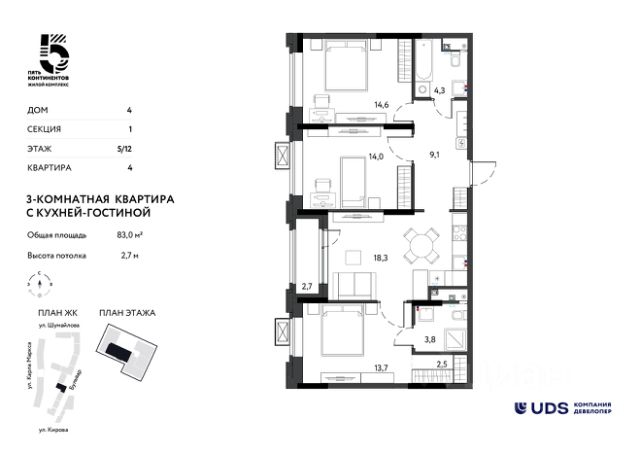 ЖИВИТЕ В ЦЕНТРЕ! Продаётся 3-комнатная квартира с кухней-гостиной от девелопера UDS в ЖК "Пять континентов" в 4 доме комплекса. Секция 3 на 5 этаже. Общая площадь — 87,5 м². Выбирайте квартиру в топовой локации Ижевска, чтобы всё успевать сегодня и создавать надёжный актив на будущее. Самый центр города — район, где кипит жизнь: на работу — без пробок, до школы — пешком. — Вдоль домов появится пешеходный бульвар для прогулок и встреч. — 15 минут до набережной и Центральной площади. Рядом детские сады 235, 189, 287, 241, 73; школы 5, 88, 11, 22, 27; частные школы SOK, NOVA; развивающие центры: Маленький гений, Сова, Знайка, АБВГД+, Tosky Talky, Cherry-Pick, Оранжевый лев, Монтессори-дворик, Слушарики. Лицей 29 — всего две остановки на трамвае. — Закрытый двор без машин — спокойно отпускайте ребёнка играть с друзьями. — Внутри комплекса — тишина и безопасность, вокруг — динамика центрального района. — Для автомобилистов: подземный паркинг и наземная стоянка. — Все виды общественного транспорта. Остановка — "магазин Океан". Кафе и магазины — на 1 этаже. Сервисы отеля у вас дома — уборка в подарок на первые 6 месяцев. Забудьте о бытовых хлопотах в новой квартире. Удобная планировка для семьи: • Большая кухня-гостиная 24,29 м² — собирайтесь вместе за большим столом. • Две детские комнаты или кабинет 11,56 м² и 14,1 м • Родительская мастер-спальня 16,6 м² с санузлом 3,42 м² • Ниша для гардеробной в прихожей • Окна выходят на Запад и Восток встречайте рассветы и уютные закаты. Передача ключей — до 30 марта 2028 года. Первые дома уже сданы. Пройдите тест-драйв ЖК — приглашаем на экскурсию. Специальные условия покупки от UDS: • Рассрочка 0% — без переплат. • Трейд-ин — обменяем вашу квартиру на новую. • Банковские программы — рассчитаем на месте. Звоните, пишите — поможем подобрать оптимальные условия. ЖК "Пять континентов" — для жизни и инвестиций. Жильё в центре — ликвид, с которым вы всегда в плюсе.