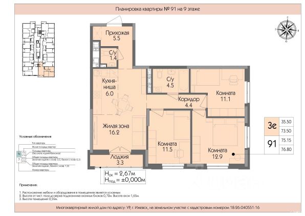 Трехкомнатная квартира евро-планировки в 25-этажной секции ЖК "Речной парк", дом 2. Кухня-гостиная 20 м2 правильной прямоугольной формы с выходом на остекленную теплую лоджию. 2 отдельные спальни, в которых можно разместить всю необходимую мебель и эргономично распланировать пространство. В квартире 2 санузла, в одном из них можно поставить стиральную машину. Грязная зона прихожей отделена от жилой части, для уличной одежды и обуви предусмотрена отдельная небольшая гардеробная комната. Окна выходят на восток, комнаты светлые - уровень подоконника 60 см от пола, высота окна 1,7 м.