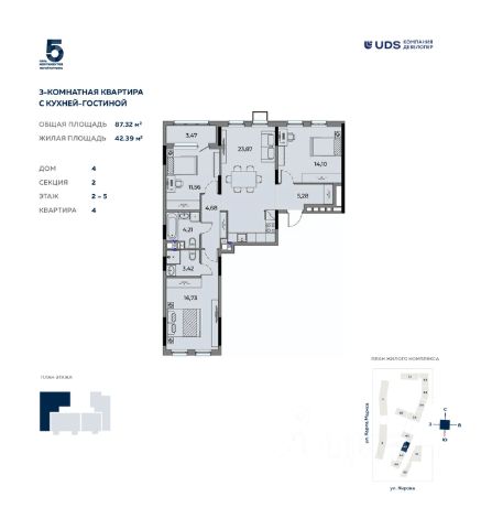 ЖК состоит из трех домов 10-ти, 14-ти и 17-этажей, объединенных общей огороженной охраняемой территорией, на которой расположены большой детский городок, спортивная площадка, прогулочные дорожки, безопасно отделенные от проездов и парковок.