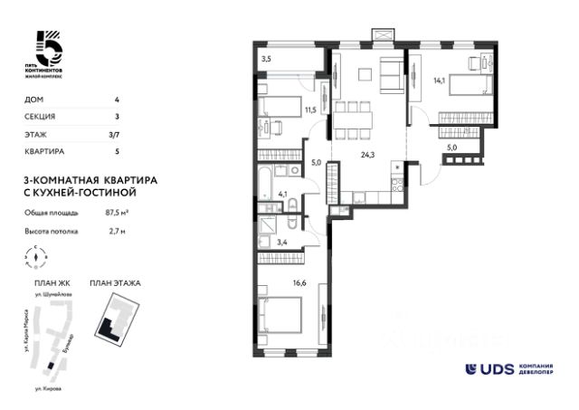 ЖИВИТЕ В ЦЕНТРЕ! Продаётся 3-комнатная квартира с кухней-гостиной от девелопера UDS в ЖК "Пять континентов" в 4 доме комплекса. Секция 2 на 2 этаже. Общая площадь — 87,32 м². Выбирайте квартиру в топовой локации Ижевска, чтобы всё успевать сегодня и создавать надёжный актив на будущее. Самый центр города — район, где кипит жизнь: на работу — без пробок, до школы — пешком. — Вдоль домов появится пешеходный бульвар для прогулок и встреч. — 15 минут до набережной и Центральной площади. Рядом детские сады 235, 189, 287, 241, 73; школы 5, 88, 11, 22, 27; частные школы SOK, NOVA; развивающие центры: Маленький гений, Сова, Знайка, АБВГД+, Tosky Talky, Cherry-Pick, Оранжевый лев, Монтессори-дворик, Слушарики. Лицей 29 — всего две остановки на трамвае. — Закрытый двор без машин — спокойно отпускайте ребёнка играть с друзьями. — Внутри комплекса — тишина и безопасность, вокруг — динамика центрального района. — Для автомобилистов: подземный паркинг и наземная стоянка. — Все виды общественного транспорта. Остановка — "магазин Океан". Кафе и магазины — на 1 этаже. Сервисы отеля у вас дома — уборка в подарок на первые 6 месяцев. Забудьте о бытовых хлопотах в новой квартире. Удобная планировка для семьи: • Большая кухня-гостиная 23,8 м² — собирайтесь вместе за большим столом. • Две детские комнаты или кабинет 11,56 м² и 14,1 м • Родительская мастер-спальня 16,73 м² с санузлом 3,42 м² • Ниша для гардеробной в прихожей • Окна выходят на Запад и Восток встречайте рассветы и уютные закаты. Передача ключей — до 30 марта 2028 года. Первые дома уже сданы. Пройдите тест-драйв ЖК — приглашаем на экскурсию. Специальные условия покупки от UDS: • Рассрочка 0% — без переплат. • Трейд-ин — обменяем вашу квартиру на новую. • Банковские программы — рассчитаем на месте. Звоните, пишите — поможем подобрать оптимальные условия. ЖК "Пять континентов" — для жизни и инвестиций. Жильё в центре — ликвид, с которым вы всегда в плюсе.