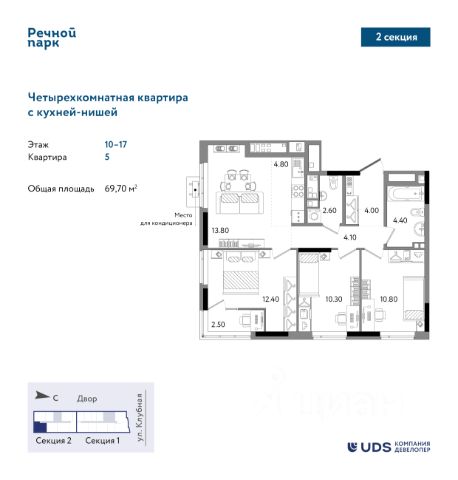 Четырехкомнатная квартира евро-планировки в 25-этажной секции ЖК ""Речной парк" дом 2. Выходит на 2 стороны света, окна на юг и восток. Кухня-гостиная почти 19 м2, правильной формы - здесь удобно расположить и кухонный гарнитур, и зону гостиной с диваном и обеденным столом. 3 отдельные спальни, в каждой запланировано место для вместительного шкафа. В одной из комнат - выход на теплую остекленную лоджи. В квартире 2 санузла, в одном из них можно установить стиральную машину. В прихожей грязная зона отделена от жилой части квартиры, есть ниша для шкафа под уличную одежду и обувь. Квартира светлая - увеличенные оконные проемы, уровень подоконника 60 см от пола, высота окна 1,7 м. При покупке недвижимости в домах UDS вы получаете в подарок 6 или 12 месяцев дополнительного сервиса отельного уровня. В зависимости от пакета в программу входит: масштабная уборка после ремонта, генеральная и регулярная поддерживающая уборка, химчистка мебели, мойка окон, глажка вещей, личный шеф-повар на праздник. Наслаждайтесь жизнью в новой квартире с первого дня и не думайте о бытовых вопросах.