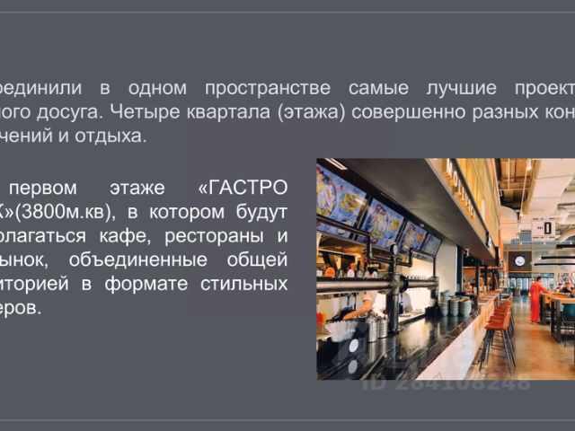 Предложение о продаже проекта Центр Семейного здоровья и отдыха АРТ КВАРТАЛ, ТЕРМЫ Стоимость проекта: 750 млн. рублей. Возможен обмен на коммерческую недвижимость, ГАБ, на земельные участки. Проект представляет собой концепцию центра Семейного здоровья и отдыха АРТ КВАРТАЛ ТЕРМЫ на площадях здания : 1-ый этаж 3800 кв.м - ГАСТРО ПАРК с кафе, ресторанами в формате стильных корнеров, экорынок. 2-ой этаж 5250 кв.м ПАРК ТЕРМ с единовременной вместимостью 1 500 человек. 3-ий этаж 3500 кв.м детский комплекс КИД ПАРК. 4-ый этаж (эксплуатируемая кровля) 4100 кв.м круглогодичный РУФ ПАРК, в котором будут сдаваться в аренду лофт помещения с банями и геокупольные беседки. А также индивидуальные мангальные зоны, общие смотровые площадки и места для отдыха для взрослых и детей. Общая площадь 16 650 м кв. Объем необходимых инвестиций 550 млн руб. Срок окупаемости менее 4,5 года. Срок реализации проекта с момента начала финансирования 6 месяцев (апрель 2023г. сентябрь 2023г.). В стоимость проекта входит: 1. Объект недвижимости Здание торгового Центра площадью 11678,4 м кв (степень готовности 60%) - 4 этажный монолитный каркас - обшит сендвич панелями, - кровля ПВХ мембрана, - вставлены окна, двери. - выполнена разводка пожарного водопровода, - смонтирован тепловой пункт, - установлена ТП на 630 кВА, с подведенной линией электропитания на 630 кВт (на данный момент отпущена мощность 140 кВт), - здание подключено к водопроводу и канализации, - в здание заведена труба центрального отопления, - смонтированы емкости системы пожаротушения. 2. Правоустанавливающие документы - договор аренды земельного участка, - разрешение на строительство, - градостроительный план земельного участка - Технический паспорт, технический план. 3. Техническая документация - актуальная проектно-сметная документация - Дизайн проект - 3 D модель - проект капитального ремонта здания Торгового центра - проект строительства здания для технологического оборудования, - проект газовой котельной - технические условия на подключение газа, тепла, электричества. 4. Разработанная концепция центра Семейного здоровья и отдыха АРТ КВАРТАЛ ТЕРМЫ. 5. Маркетинговое исследование по г. Ижевску на предмет привлекательности размещения на данных площадях ПАРК ТЕРМ. 6. Финансовая модель, бизнес план. 7. Презентации проекта. 8. Опытная команда ключевых сотрудников для запуска и эксплуатации проекта.