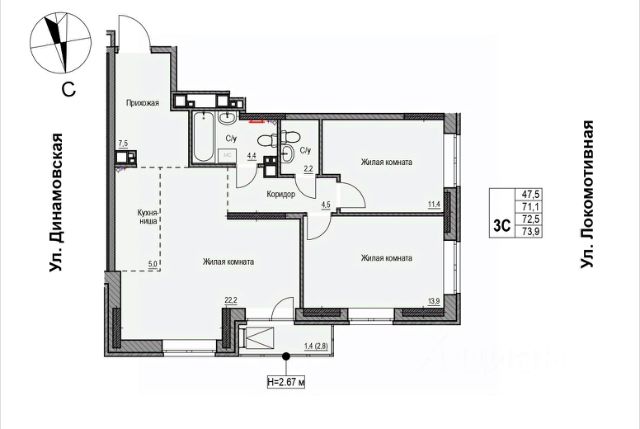 Продаётся 4-комнатная квартира в строящемся доме (Дом 1), срок сдачи: II-кв. 2027, общей площадью 71.9 кв.м., на 2 этаже. ЖК "Локомотив" - это жилой комплекс, состоящий из трех домов, объединенных стилобатом. Удобное расположение, 15 минут до центра.