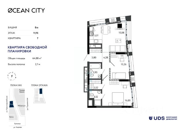 ДОМ СДАН! КЛЮЧИ - СРАЗУ Продаётся 2-комнатная квартира с кухней-гостиной от девелопера UDS в ЖК "Пять континентов" в 3 доме комплекса. Секция 2 на 11 этаже. Общая площадь — 45,83 м². Выбирайте квартиру в топовой локации Ижевска, чтобы всё успевать сегодня и создавать надёжный актив на будущее. — Самый центр города — район, где кипит жизнь. — Пешеходный бульвар вдоль домов — ваша зелёная зона для прогулок, пробежек и встреч в любое время, прямо под окнами. — Все виды общественного транспорта. Остановка — "магазин Океан". — 15 минут до набережной и Центральной площади. Рядом вся необходимая инфраструктура: детские сады, школы, магазины и кафе. — Закрытый двор без машин — спокойно отдыхайте после рабочего дня. — Внутри комплекса — тишина и безопасность, вокруг — динамика центрального района. — Для автомобилистов: подземный паркинг и наземная стоянка. Кафе и магазины — на 1 этаже. Сервисы отеля у вас дома — при покупке недвижимости в домах UDS получаете в подарок 6 месяцев сервиса: масштабная уборка после ремонта, генеральная и регулярная поддерживающая уборка, химчистка мебели, мойка окон. Наслаждайтесь жизнью в новой квартире с первого дня и не думайте о бытовых вопросах. Идеальная планировка для начала новой жизни: • Просторная кухня-гостиная 19,56 м² с лоджией 3,91 м² • Гардеробная в прихожей 3,26 м² • Спальня 10,97 м² с большим окном • Окна на 2 стороны света Отличный вариант для инвестиций или как первая квартира для ребёнка. Ключи — сразу. Дом сдан. Приглашаем на экскурсию. Специальные условия покупки от UDS: • Трейд-ин — обменяем вашу квартиру на новую. • Банковские программы — рассчитаем на месте. Звоните, пишите — поможем подобрать оптимальные условия. ЖК "Пять континентов" — для жизни и инвестиций. Жильё в центре — ликвид, с которым вы всегда в плюсе.