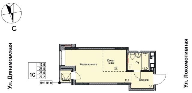 Продаётся 1-комнатная квартира в строящемся доме (Дом 1), срок сдачи: II-кв. 2027, общей площадью 27.3 кв.м., на 1 этаже. ЖК "Локомотив" - это жилой комплекс, состоящий из трех домов, объединенных стилобатом. Удобное расположение, 15 минут до центра.