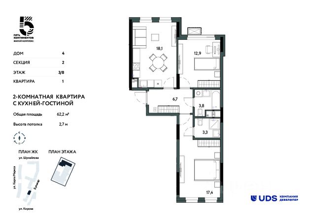 Продаётся студия в строящемся доме (Дом 2), срок сдачи: IV-кв. 2027, общей площадью 95 кв.м., на 16 этаже. Объявление от застройщика КОМОССТРОЙ. Покупка защищена ФЗ 214 с использованием эскроу счетов. Жилой комплекс расположен в самом центре Ижевска, на улице К. Маркса, ниже Центральной площади, вдоль эспланады, соединяющей площадь с монументом Дружбы народов и Набережной Ижевского Пруда. Благодаря выгодному расположению на вершине холма, практически из всех квартир комплекса будут открываться потрясающие виды на монумент Дружбы народов, Ижевский Пруд, Михаило-Архангельский кафедральный собор и Центральную Площадь города Ижевска. В шаговой доступности от комплекса расположены десятки детских садов, общеобразовательные средние школы, Удмуртский Государственный Университет, Медицинская Академия, спортивные клубы, магазины, офисы ведущих предприятий города, Госсовет Удмуртской Республики и Дворец Главы Удмуртской Республики. Жилой комплекс представляет собой два жилых многоэтажных дома, расположенных на едином стилобате. В стилобате будут расположены: двухуровневый подземный паркинг, спортивный клуб с бассейном, офисные и торговые помещения. В спортивный клуб и в паркинг жильцы дома смогут спуститься прямо со своего этажа, не выходя на улицу. Квартира: Квартиры передаем собственникам со свободной планировкой. Внутриквартирные перегородки выполняем только для санузлов. Благодаря увеличенным пролетам между несущими конструкциями здания, 7,5 - 9,0 м, вы сможете реализовать в своей квартире практически любой дизайн-проект. Устанавливаем надежные противопожарные металлические входные двери размером 2,1 на 1,0 м. В связи с тем, что квартира передается со свободной планировкой, прокладку электросетей выполняем только до осветительных приборов в санузлах и коридоре. На входе в квартиру устанавливаем электрическую розетку, на кухне - клеммную коробку для подключения электроплиты. Вода и отопление подаются с единого распределительного узла, расположенного за пределами квартиры. Проводить поверки и снимать показания счетчиков управляющая компания сможет без доступа в вашу квартиру. Для каждой квартиры предусмотрено место для установки внешнего блока кондиционеров в зоне переходной лоджии. В конструкцию стен коридоров заложен канал для прокладки коммуникаций от внешнего блока до квартиры. Умный дом: Специально для будущих жителей Республики мы собрали все самые полезные и актуальные функции "Умного Дома": - Бесключевой доступ на территорию двора, парковку и в квартиру. - Умный шлагбаум с функцией пропускного контроля. - Видеодомофон и видеонаблюдение. - Контроль задымления и протечек. - Автоматизированный сбор и передача показаний счётчиков. - Управление питанием и системой отопления. - Дистанционное управление открывания оконных створок. Все вопросы можно уточнить в отделе продаж по телефону. Звоните!