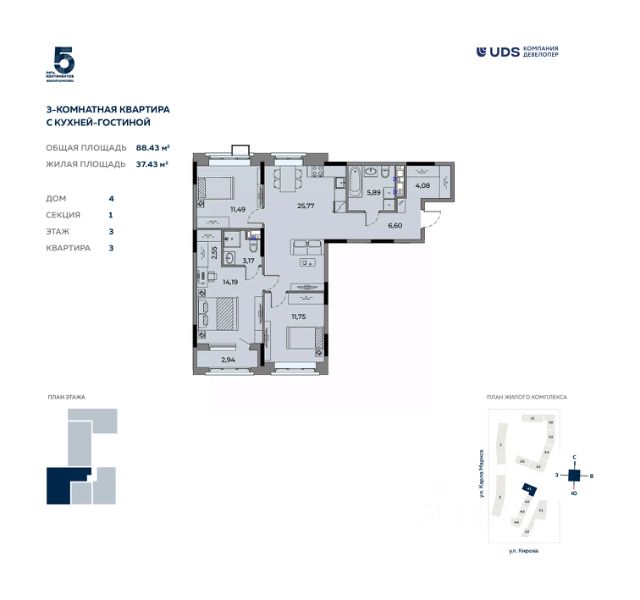 в ЖК "Пять континентов", дом 3, секция 6 на 3 этаже.