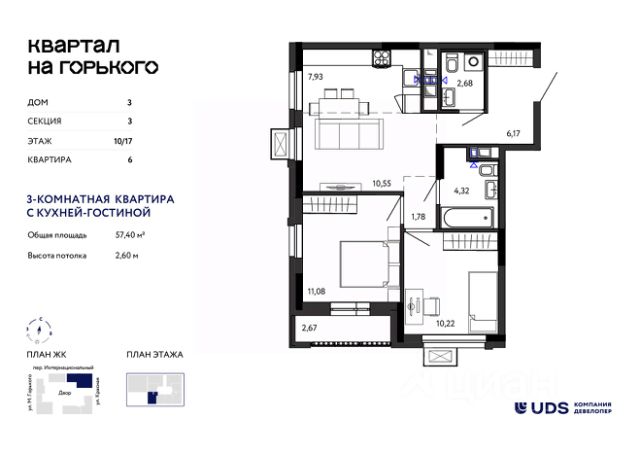 СТАРТ ПРОДАЖ! Продаётся 3-комнатная квартира с кухней-гостиной от девелопера UDS в ЖК "Квартал на Горького", дом 3, секция 1, на 2 этаже. Площадь — 53,55 м². Это финальный дом комплекса в историческом центре Ижевска — рядом школы, культурные пространства и удобная городская инфраструктура. Идеальный вариант для семьи: • Кухня-гостиная 15,82м² с лоджией — уютная общая зона для совместных ужинов • Спальня родителей 10,03 м² — с окнами во двор • Детская комната 9,94 м² • Два санузла (3,67 м² и 1,78 м²) — большое преимущество для жизнь семьи Учебные заведения рядом: Школа 25, школа искусств 2, детские сады — всё в шаговой доступности. Инфраструктура и досуг: Театры, набережная, Летний сад — отличные места для прогулок и отдыха. Закрытый двор без машин — безопасно и комфортно. Остановки в 2 минутах, 22 маршрута транспорта — удобно передвигаться по городу. Секция всего 6 этажей — меньше соседей, больше приватности. Живите в центре Ижевска и используйте преимущества окружения. Недвижимость в центре — надёжный актив, который сохраняет и приумножает капитал семьи.