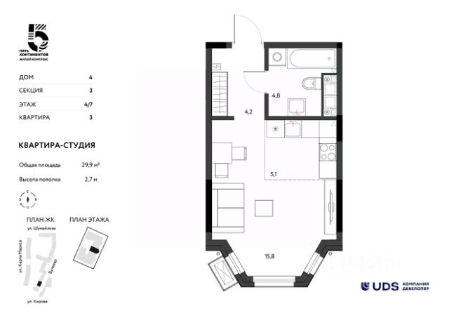 Бизнес-класс на ул. Кирова. Воплощайте мечты о доме в бульварном квартале "Пять континентов". Здесь вы сможете жить в центре Ижевска в эстетичном современном пространстве. Дома комплекса спроектированы по европейским тенденциям международным архитектурным бюро MLA+. Здесь общественные городские и частные зоны разделены не привычными заборами, а гармонично соседствуют друг с другом. Вдоль домов "Пяти континентов" пройдет городской пешеходный бульвар и станет новым маршрутом прогулок и отдыха. Бульвар начнется со сквера на пересечении улиц Кирова и Карла Маркса. И уже сейчас часть сквера построена, приходите и оцените вживую. Если вы хотите жить в невысотном доме в спокойной обстановке, то в "Пяти континентах" вам подойдут уютные дома с эркерами и лоджиями высотой всего 6, 7 и 9 этажей. А если нравятся высотные дома, то в "Пяти континентах" вы увидите и высотные секции внутри квартала высотой 12 и 17 этажей. Ездить на автомобиле ежедневно или добираться пешком жителям "Пяти континентах" удобно одинаково. В комплексе есть подземный паркинг, и, в целом, он выгодно расположен на пересечении улиц Кирова и Карла Маркса, рядом с остановкой "Магазин "Океан". В 15 минутах хотьбы - Центральная площадь и набережная. Здания комплекса примыкают друг другу торцами и создают единую архитектурную форму. Дома по обе стороны бульвара задают направление для прогулок, а волнообразный рисунок брусчатки и плавные изгибы делают бульвар похожим на русло реки. Каждый дом комплекса отличается от другого этажностью, формой, цветом, геометрией фасада. • 6-17 этажей высота домов, • Всего 5 квартир на этаже, • На -1 этаже подземный паркинг, • Высота потолка 2,7 м, • Сквозной вход в дом с улицы и со двора, • Огороженный двор без машин. Передача ключей 1 квартал 2028 года. При покупке недвижимости в домах UDS вы получаете в подарок 6 или 12 месяцев дополнительного сервиса отельного уровня. В зависимости от пакета в программу входит: масштабная уборка после ремонта, генеральная и регулярная поддерживающая уборка, химчистка мебели, мойка окон, глажка вещей, личный шеф-повар на праздник. Наслаждайтесь жизнью в новой квартире с первого дня и не думайте о бытовых вопросах.