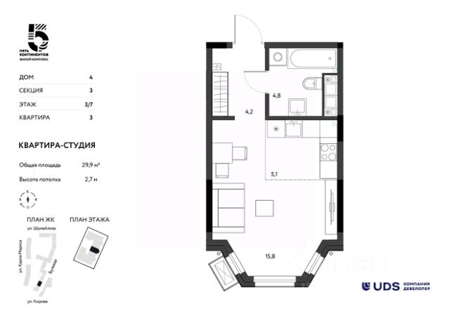Бизнес-класс на ул. Кирова. Воплощайте мечты о доме в бульварном квартале "Пять континентов". Здесь вы сможете жить в центре Ижевска в эстетичном современном пространстве. Дома комплекса спроектированы по европейским тенденциям международным архитектурным бюро MLA+. Здесь общественные городские и частные зоны разделены не привычными заборами, а гармонично соседствуют друг с другом. Вдоль домов "Пяти континентов" пройдет городской пешеходный бульвар и станет новым маршрутом прогулок и отдыха. Бульвар начнется со сквера на пересечении улиц Кирова и Карла Маркса. И уже сейчас часть сквера построена, приходите и оцените вживую. Если вы хотите жить в невысотном доме в спокойной обстановке, то в "Пяти континентах" вам подойдут уютные дома с эркерами и лоджиями высотой всего 6, 7 и 9 этажей. А если нравятся высотные дома, то в "Пяти континентах" вы увидите и высотные секции внутри квартала высотой 12 и 17 этажей. Ездить на автомобиле ежедневно или добираться пешком жителям "Пяти континентах" удобно одинаково. В комплексе есть подземный паркинг, и, в целом, он выгодно расположен на пересечении улиц Кирова и Карла Маркса, рядом с остановкой "Магазин "Океан". В 15 минутах хотьбы - Центральная площадь и набережная. Здания комплекса примыкают друг другу торцами и создают единую архитектурную форму. Дома по обе стороны бульвара задают направление для прогулок, а волнообразный рисунок брусчатки и плавные изгибы делают бульвар похожим на русло реки. Каждый дом комплекса отличается от другого этажностью, формой, цветом, геометрией фасада. • 6-17 этажей высота домов, • Всего 5 квартир на этаже, • На -1 этаже подземный паркинг, • Высота потолка 2,7 м, • Сквозной вход в дом с улицы и со двора, • Огороженный двор без машин. Передача ключей 1 квартал 2028 года. При покупке недвижимости в домах UDS вы получаете в подарок 6 или 12 месяцев дополнительного сервиса отельного уровня. В зависимости от пакета в программу входит: масштабная уборка после ремонта, генеральная и регулярная поддерживающая уборка, химчистка мебели, мойка окон, глажка вещей, личный шеф-повар на праздник. Наслаждайтесь жизнью в новой квартире с первого дня и не думайте о бытовых вопросах. Купить квартиру-студию квартир-студий в Пять континентов в Ижевске.