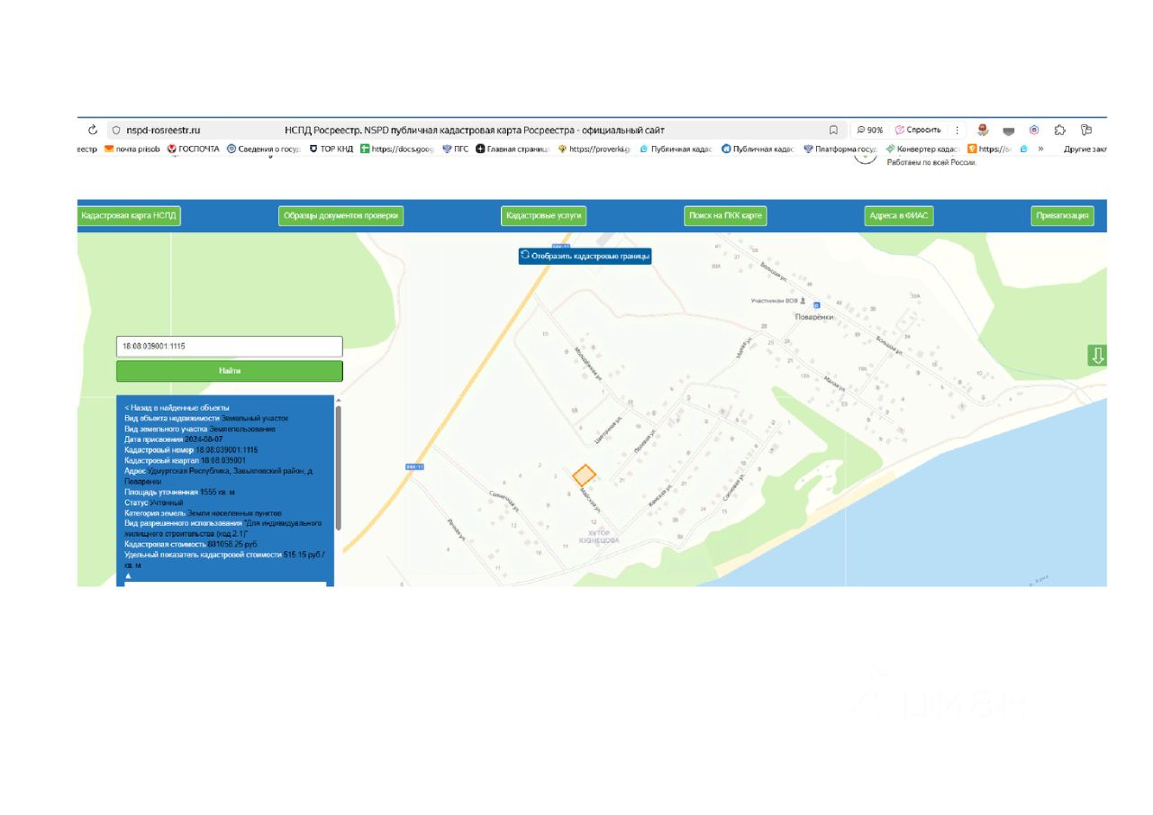 Земельный участок с кадастровым номером 18:08:039001:1115 площадь 1555 по адресу Удмуртская Республика, Завьяловский район, д. Поваренки