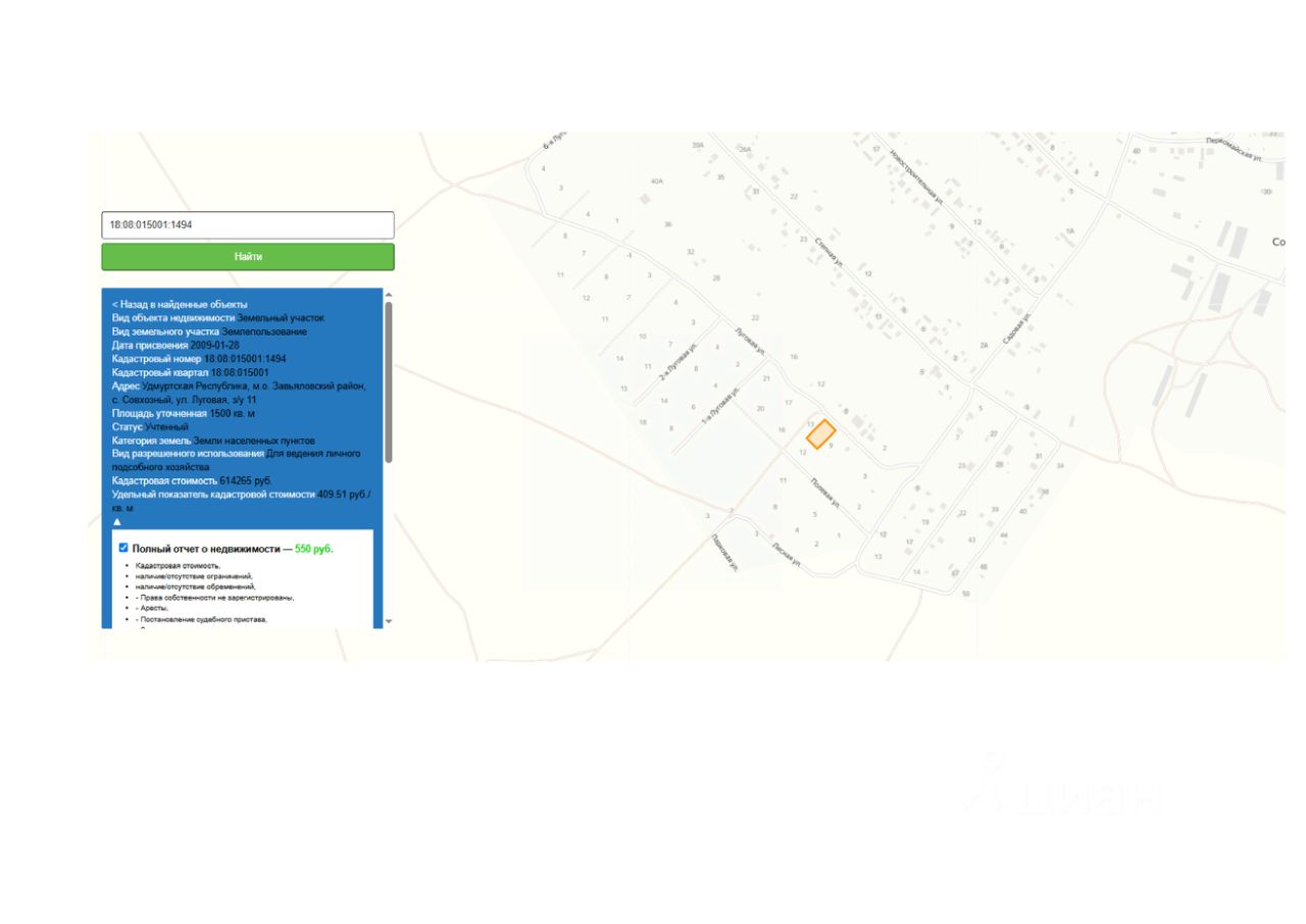 Земельный участок с кадастровым номером 18:08:015001:1494 площадь 1500 по адресу Удмуртская Республика, м.о. Завьяловский район, с. Совхозный, ул. Луговая, з/у 11