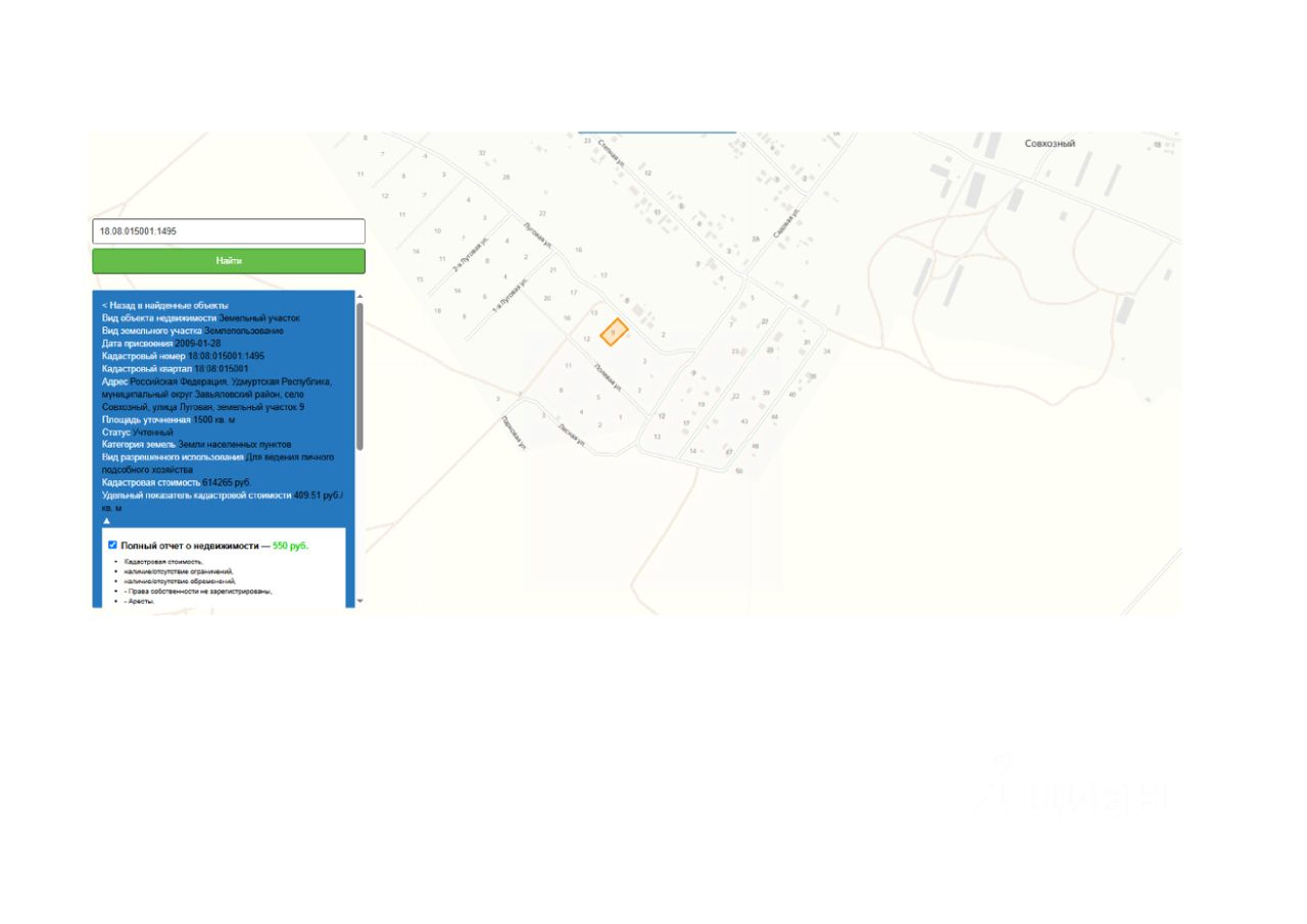 Земельный участок с кадастровым номером 18:08:015001:1495 площадь 1500 по адресу Российская Федерация, Удмуртская Республика, муниципальный округ Завьяловский район, село Совхозный, улица Луговая, земельный участок 9