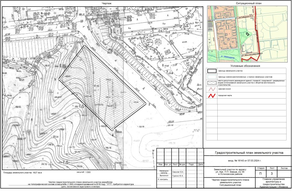 Аренда земельного участка с кадастровым номером 18:26:030058:5261, с адресом: Удмуртская Республика, городской округ город Ижевск, город Ижевск, улица архитектора П.П.Берша, земельный участок 30, площадью 1627 кв.м., с разрешенным использованием: Спорт (код 5.1). Физкультурно-оздоровительные комплексы, спортивные комплексы и залы, бассейны, спортивные площадки и иные спортивные объекты районного значения. Общественное питание (код 4.6). Объекты, расчитанные на малый поток посетителей (менее 150 кв.м общей площади). Объекты общей площадью от 150 кв.м до 1000 кв.м.
