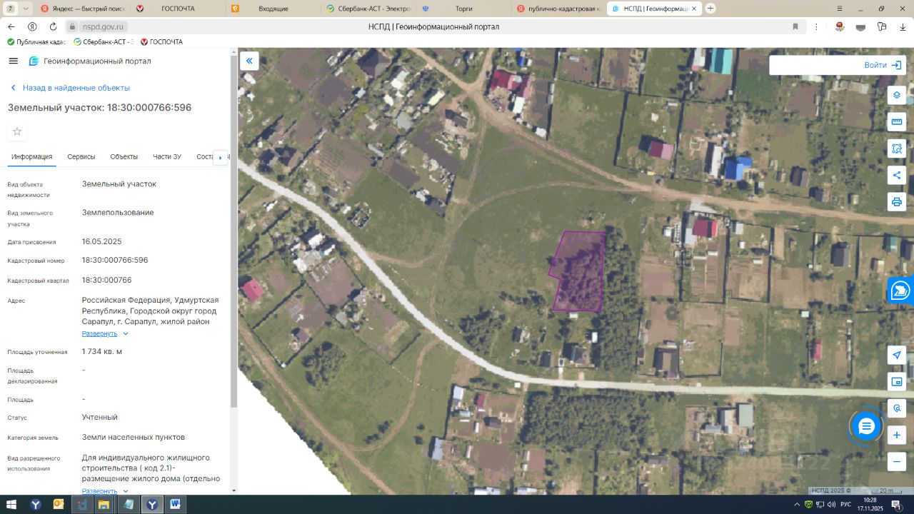 Аукцион в электронной форме на право заключения договора аренды земельного участка площадью 1734 кв.м., кадастровый номер 18:30:000766:596, расположенного по адресу: Российская Федерация, Удмуртская Республика, Городской округ город Сарапул, г. Сарапул, жилой район Дубровка, улица 3-я Лесная, земельный участок 25, категория земель: земли населенных пунктов, вид разрешенного использования: "Для индивидуального жилищного строительства (код 2.1)"