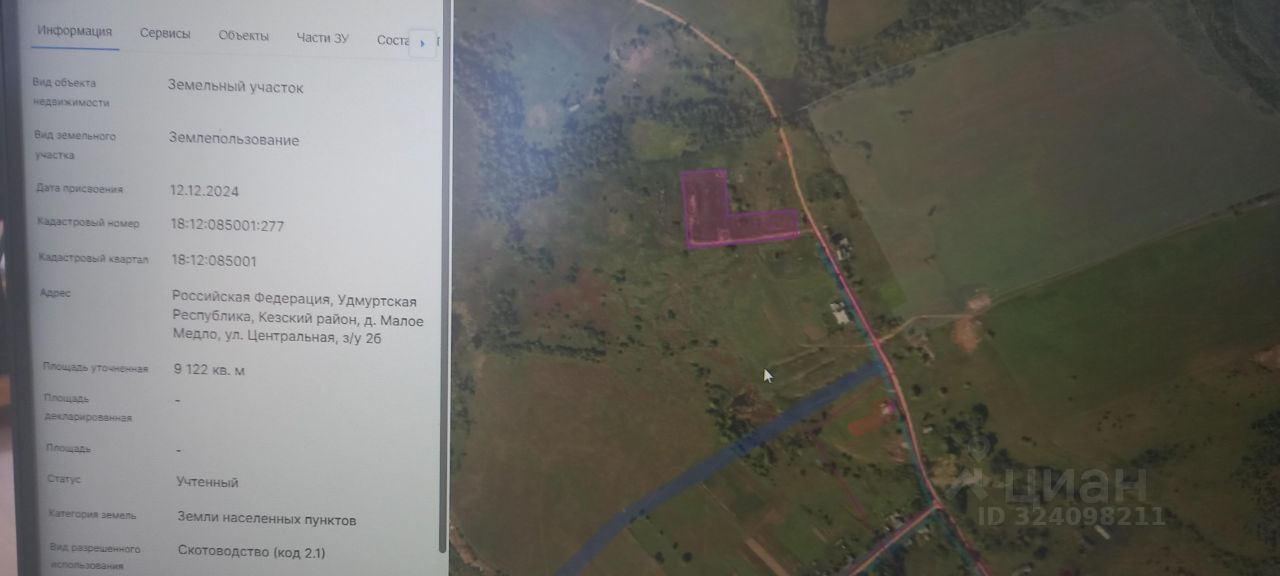 Аукцион в электронной форме с открытой формой подачи предложений по цене на право заключения договора аренды земельного участка с кадастровым номером 18:12:085001:277 площадью 9122 кв.м., по адресу: Российская Федерация, Удмуртская Республика, Кезский район, д. Малое МЕДЛО, ул. Центральная, з/у 2б. Разрешенное использование земельного участка Скотоводство (код 2.1)