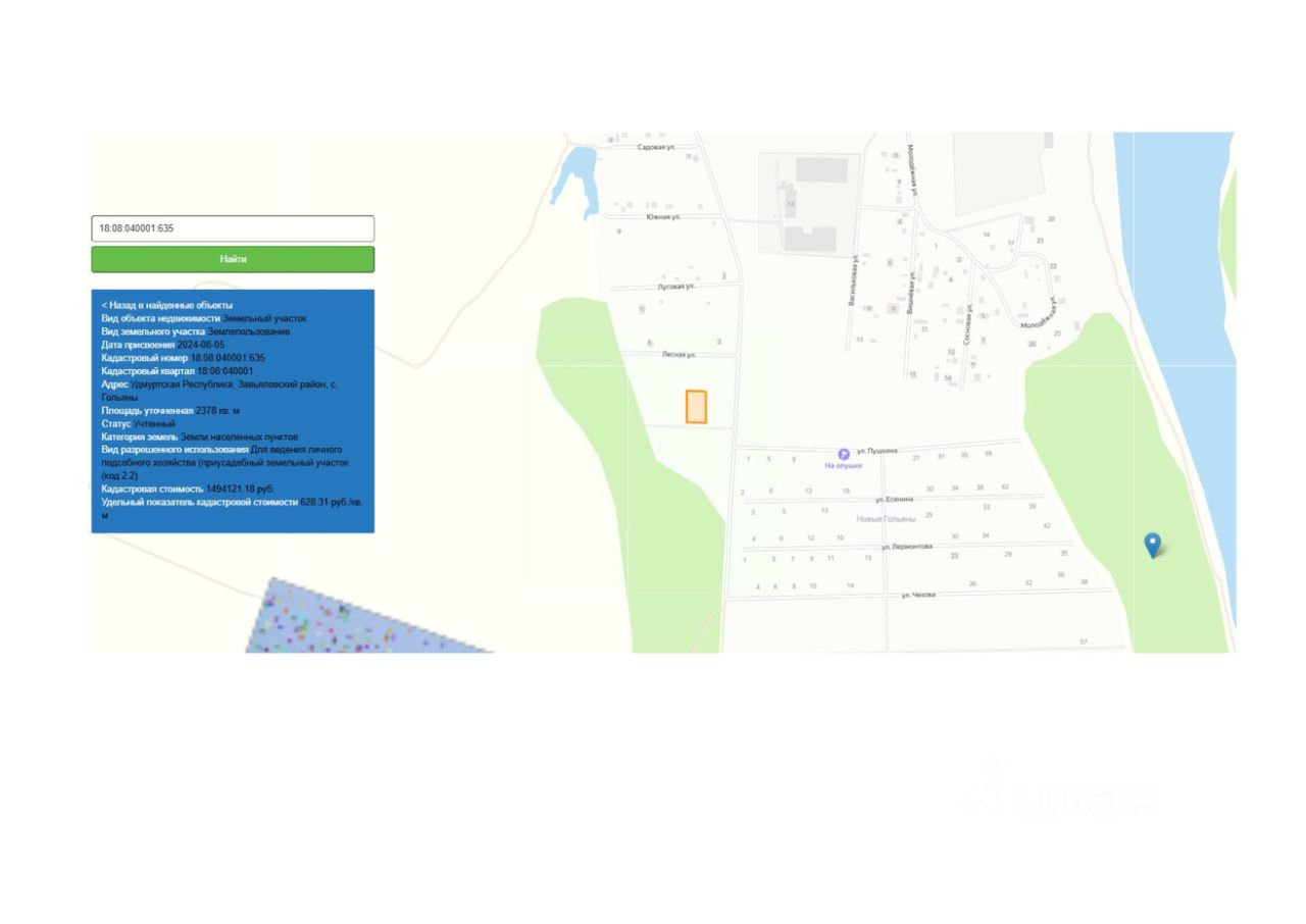 Земельный участок с кадастровым номером 18:08:040001:635 площадь 2378 по адресу Удмуртская Республика, Завьяловский район, с. Гольяны
