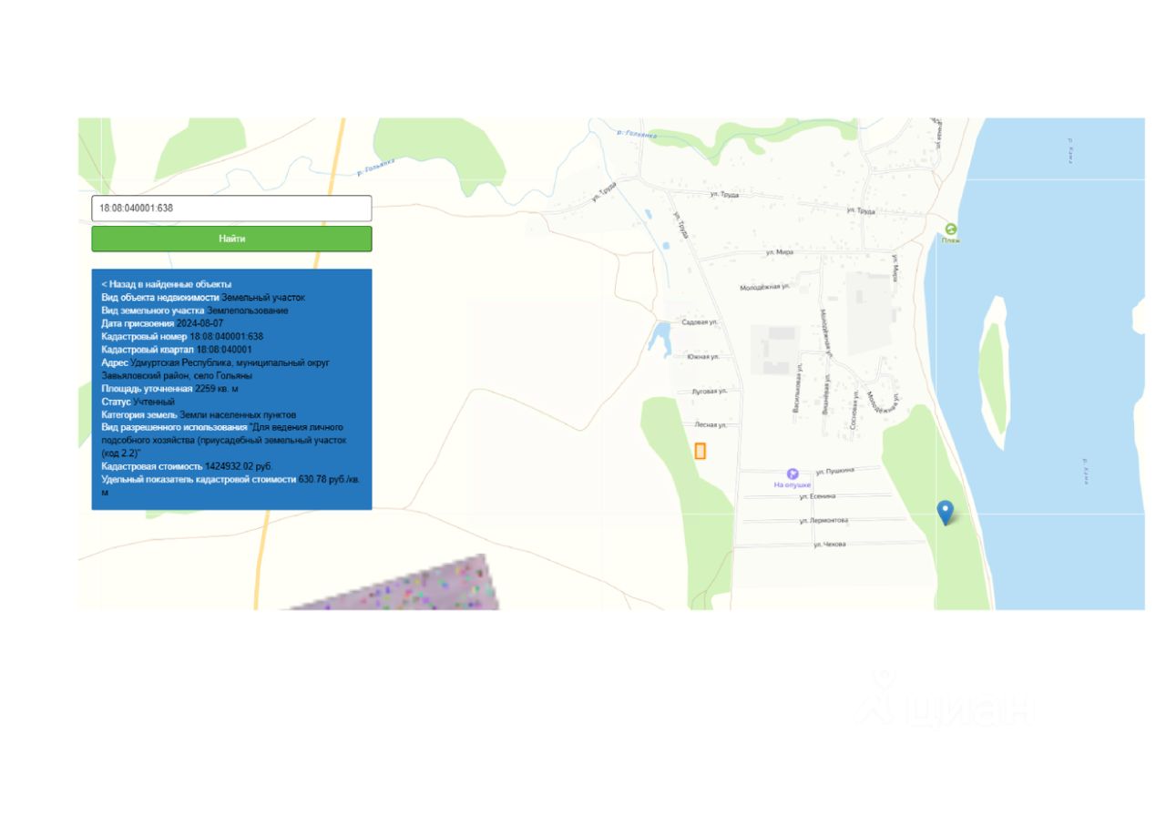 Земельный участок с кадастровым номером 18:08:040001:638 площадь 2259 по адресу Удмуртская Республика, муниципальный округ Завьяловский район, село Гольяны