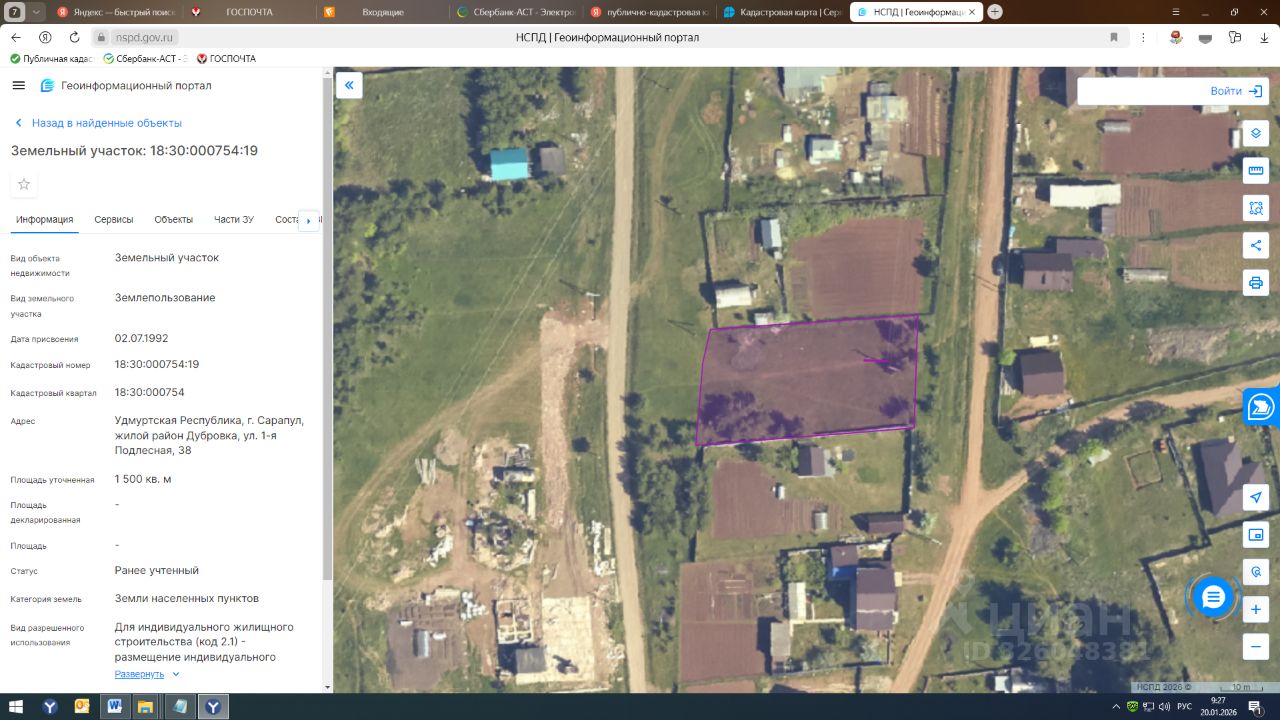 Аукцион в электронной форме на право заключения договора аренды земельного участка площадью 1500 кв.м., кадастровый номер 18:30:000754:19, расположенного по адресу: Удмуртская Республика, г. Сарапул, жилой район Дубровка, ул. 1-я Подлесная, 38, категория земель: земли населенных пунктов, вид разрешенного использования: для индивидуального жилищного строительства (код 2.1) размещение индивидуального жилого дома.