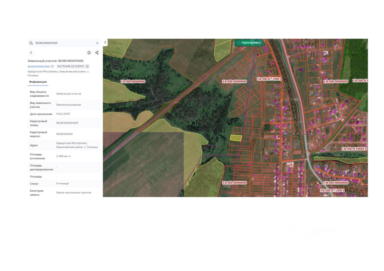 Земельный участок с кадастровым номером 18:08:040001:645 площадь 2499 по адресу Удмуртская Республика, Завьяловский район, с. Гольяны