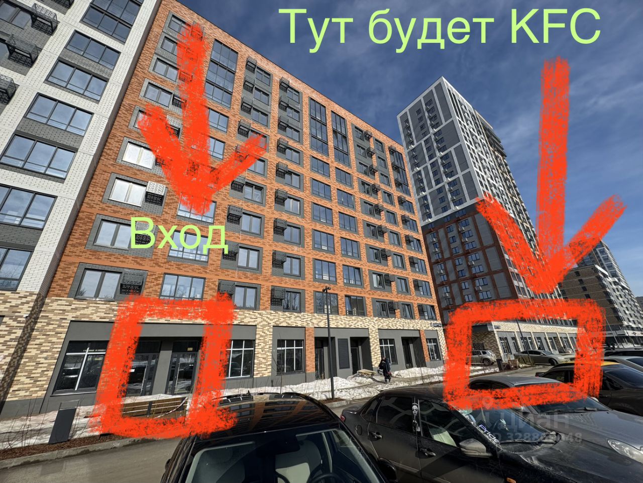 -Также в соседнем доме справа от входа планируется размещение крупного федеральной сети ресторанов быстрого питания, что также обеспечит высокую проходимость. На фото можно оценить, что вход в данное помещение наиболее удачен по сравнению с другими.