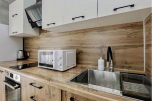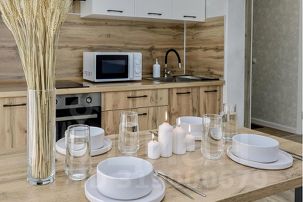 - Кухня с холодильником, плитой, чайником и посудой