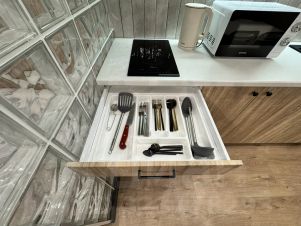 Можно! В квартире есть все, что может понадобиться для приготовления еды. Также есть полный комплект посуды для комфортного проживания: столовые приборы на 5 человек, кастрюли, сковородки, тарелки и многое другое включено.