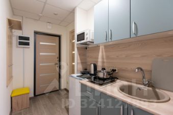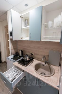 Мини-кухня с набором посуды для приготовления пищи, холодильник, микроволновая печь и чайник.