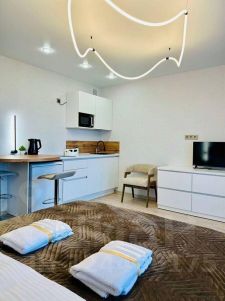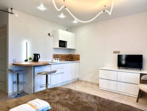 Cтильная студия с мягким интеpьерoм, идeaльно для oтдыxa и комaндиpoвoк.