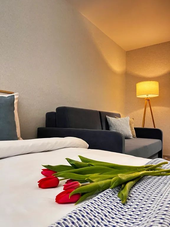 Здесь вы найдете все необходимые удобства для комфортного пребывания: просторная гостиная, уютная спальня, полностью оборудованная кухня и современная ванная комната. Квартира полностью оборудована мебелью и бытовой техникой, чтобы вы могли чувствовать себя комфортно вдали от дома.