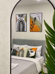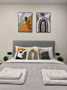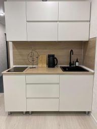 В апартаментах двуспальная кровать с ортопедическим матрасом. На кухне вся необходимая техника и посуда: холодильник, электрический чайник, варочная панель, микроволновая печь, набор посуды. Из мебели к пользованию: шкаф для одежды и вещей, гладильная доска, сушилка для белья. К услугам гостей: телевизор и Wi-Fi, стиральная машинка, утюг, фен. В доме есть лифт. Во дворе парковка.