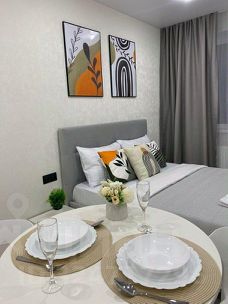 Однокомнатные апартаменты-студия с балконом подойдут для размещения 2 гостей. Спальное место: двуспальная кровать. На кухне вся необходимая техника и посуда: холодильник, электрический чайник, варочная панель, микроволновая печь, набор посуды. Из мебели к пользованию: шкаф для одежды и вещей, гладильная доска, сушилка для белья. К услугам гостей: телевизор и Wi-Fi, стиральная машинка, утюг, фен. В доме есть лифт. Во дворе парковка.