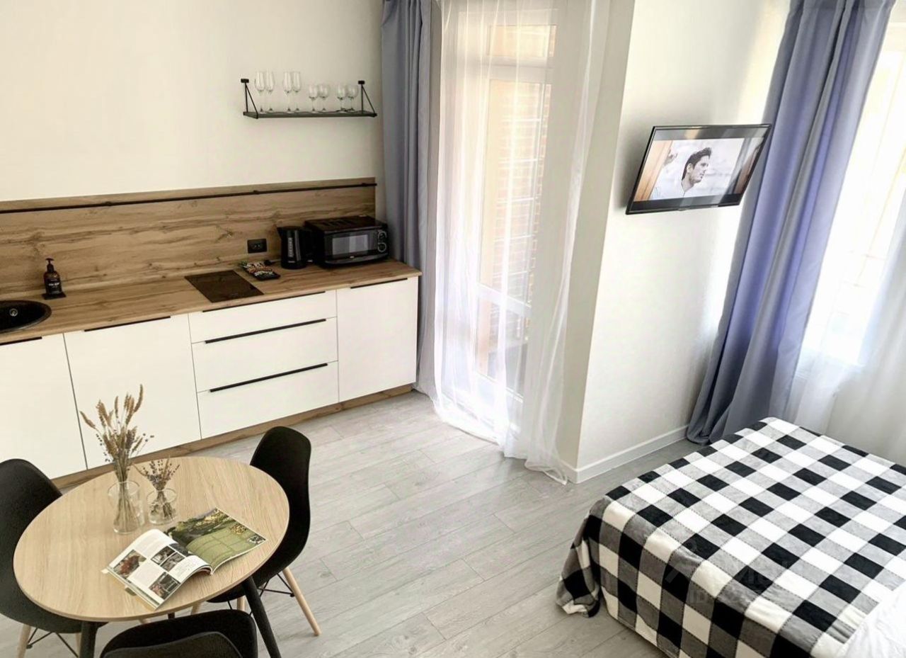 Однокомнатные апартаменты-студия подойдут для размещения 4 человек. Спальные места: двуспальная кровать 140*200, диван раскладной 140*200. В кухонной зоне: холодильник, чайник, плита, СВЧ-печь, посуда и кухонные принадлежности. Для пользования доступны: WI-FI, Smart TV, стиральная машина, утюг, фен. Совмещенный санузел с ванной. Постельное белье, полотенца и туалетные принадлежности предоставляются.