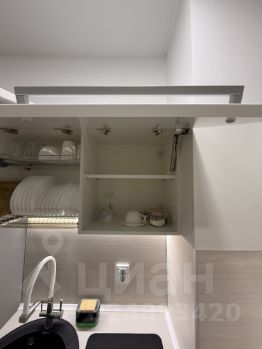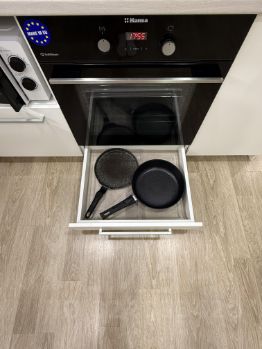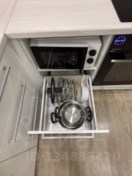 Кухонный гарнитур оснащен бытовой техникой: встроенная индукционная плита, духовой шкаф и вытяжка. Имеется холодильник, микроволновка, чайник, посуда (все, как на фото), столовые приборы (все, как на фото).