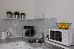 На кухне Вы можете самостоятельно приготовить блюда или разогреть готовую пищу в микроволновой печи, также есть чайник, холодильник, варочная панель, набор посуды и столовых принадлежностей.