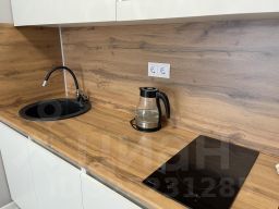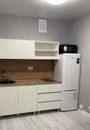 Кухня с плитой и холодильником,микроволновой печью и чайником;