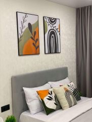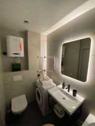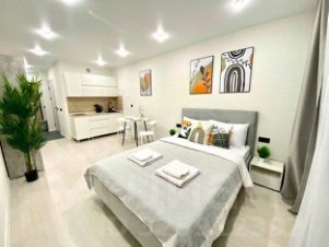 В апартаментах двуспальная кровать с ортопедическим матрасом. На кухне вся необходимая техника и посуда: холодильник, электрический чайник, варочная панель, микроволновая печь, набор посуды. Из мебели к пользованию: шкаф для одежды и вещей, гладильная доска, сушилка для белья. К услугам гостей: телевизор и Wi-Fi, стиральная машинка, утюг, фен. В доме есть лифт. Во дворе парковка.