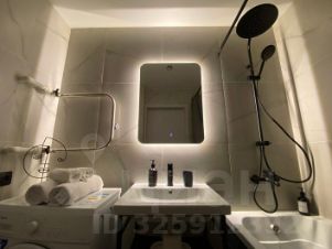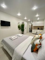 Однокомнатные апартаменты-студия с балконом подойдут для размещения 2 гостей. Спальное место: двуспальная кровать. На кухне вся необходимая техника и посуда: холодильник, электрический чайник, варочная панель, микроволновая печь, набор посуды. Из мебели к пользованию: шкаф для одежды и вещей, гладильная доска, сушилка для белья. К услугам гостей: телевизор и Wi-Fi, стиральная машинка, утюг, фен. В доме есть лифт. Во дворе парковка.